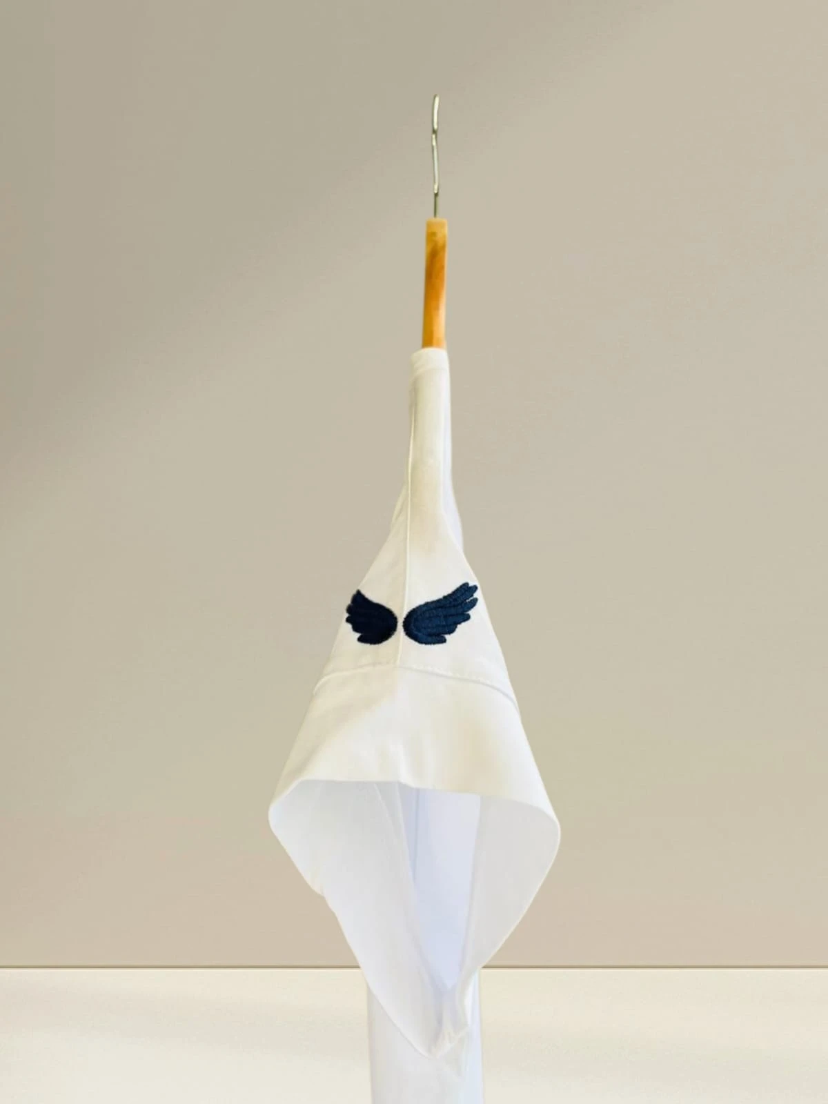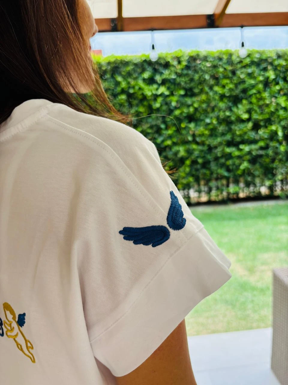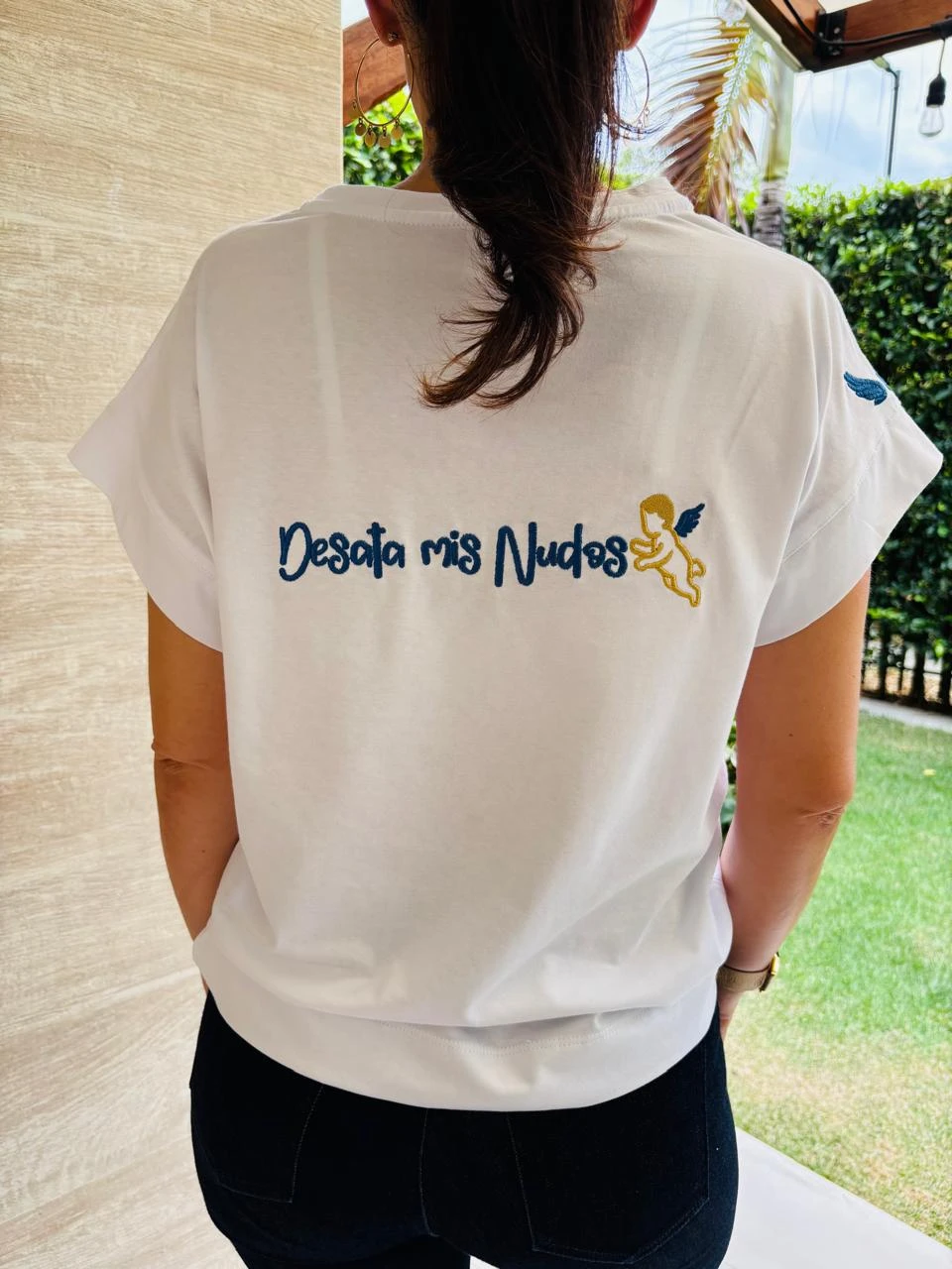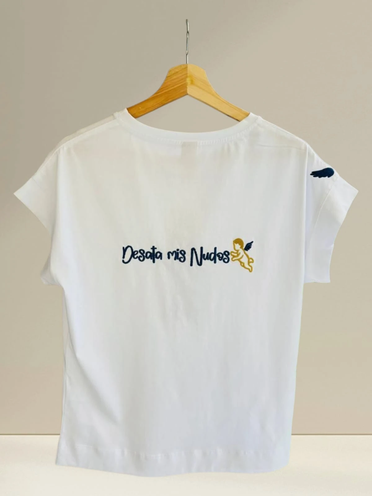 En la manga derecha se encuentra nuestra alita distintiva, bordada en hilo azul a juego con el vestido de la Virgen. En la espalda se borda la frase: “Desata mis nudos” en hilo azul, acompañada de un angelito bordado en dorado, con sus alitas en azul, como símbolo de luz y esperanza.