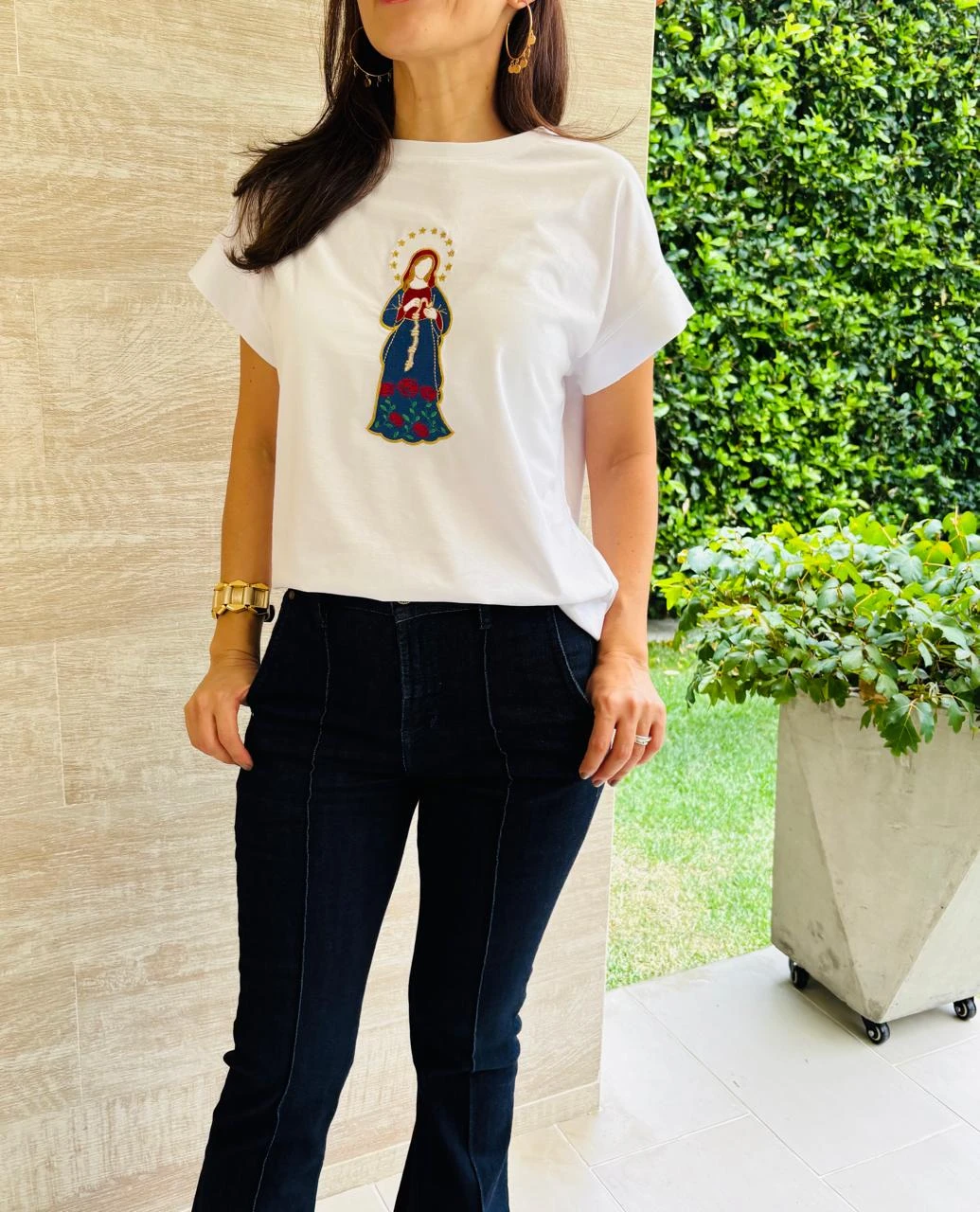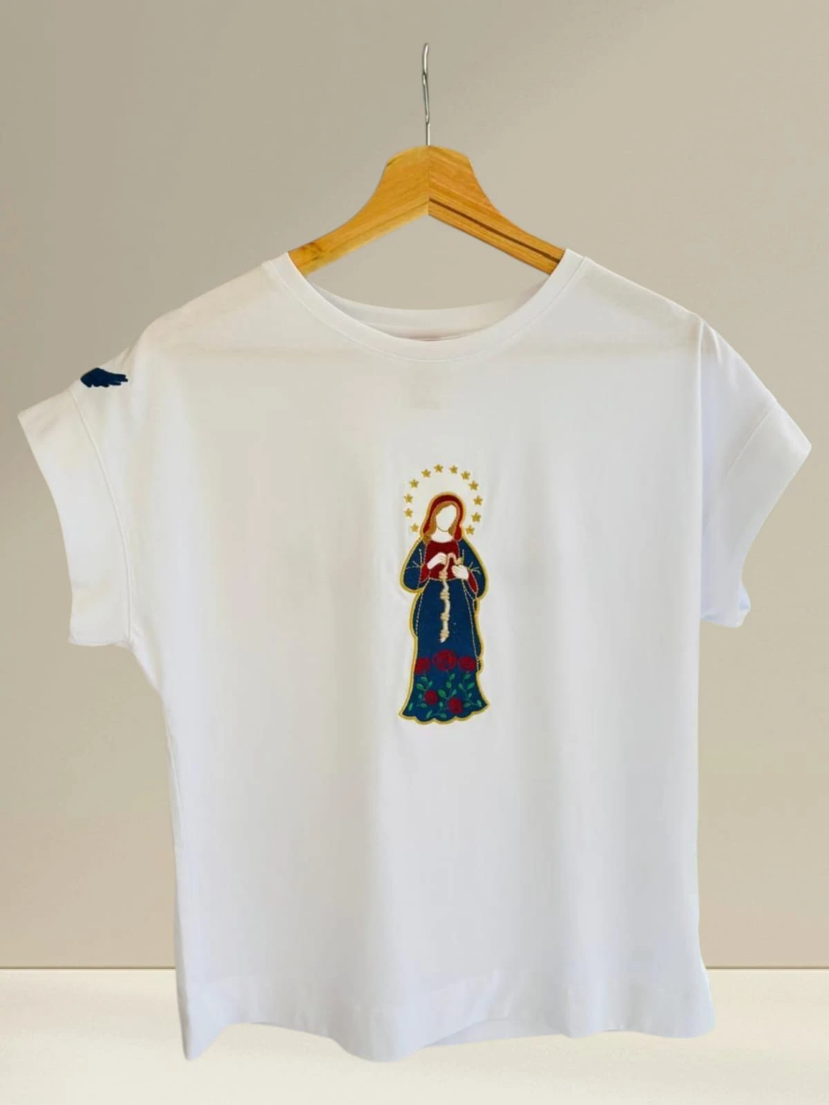 Camiseta confeccionada en 100% algodón pima peruano, con un bordado de alta calidad que resalta por su riqueza de detalles y espiritualidad. En la parte frontal, la protagonista es la Virgen de Satanudos, representada con una silueta bordada en hilo dorado y vestida en un tono azul profundo. Su diseño incluye: