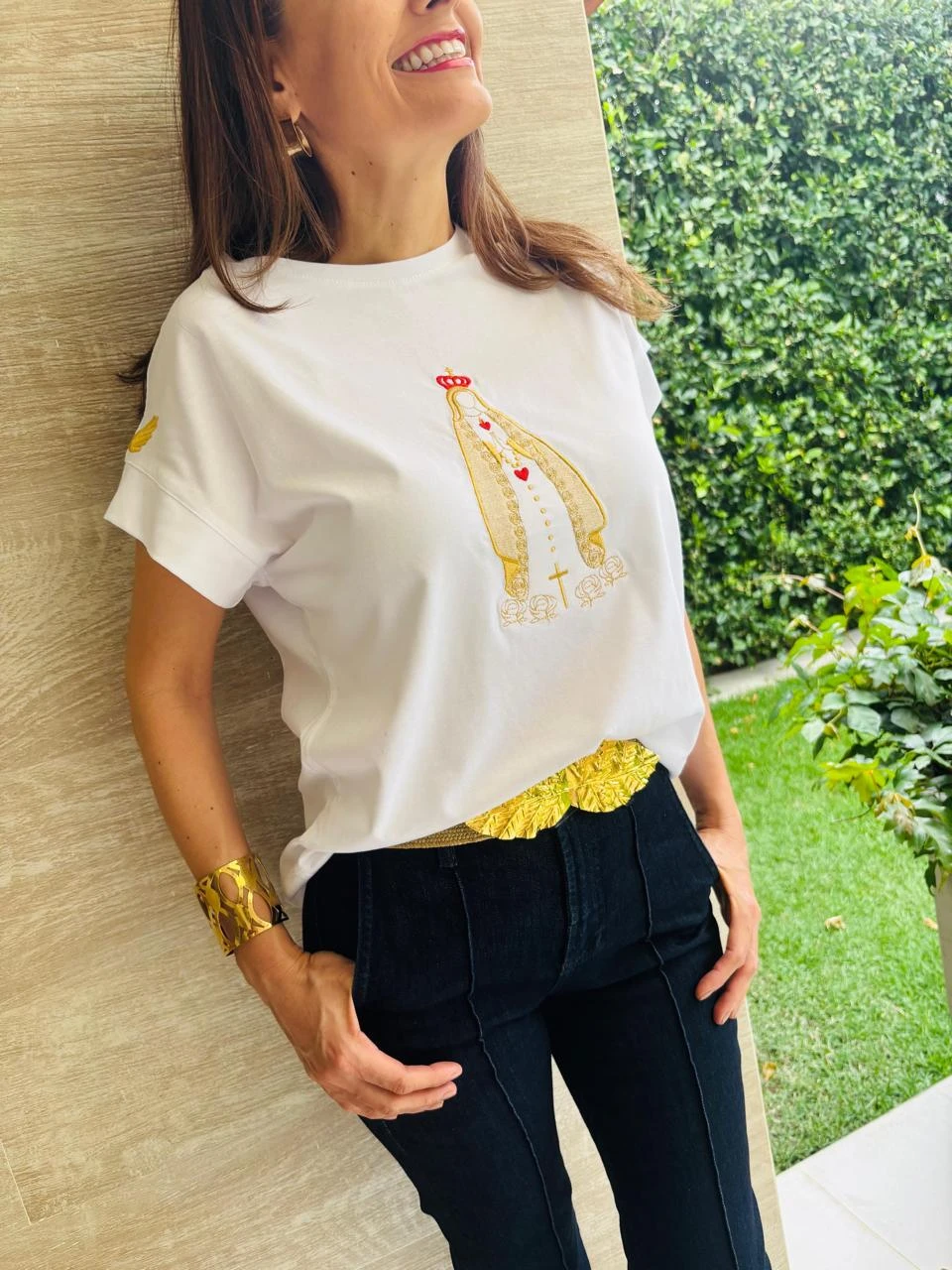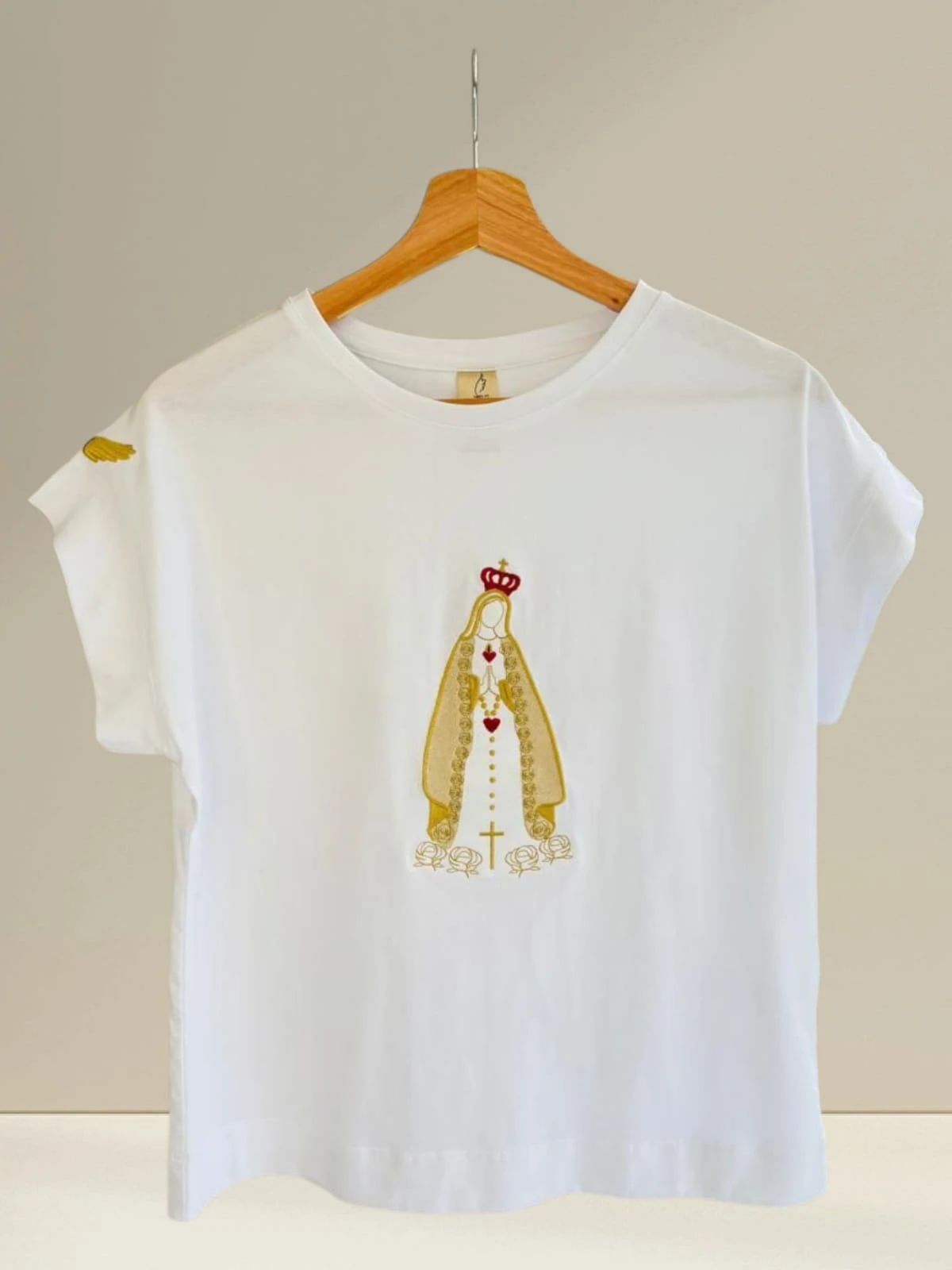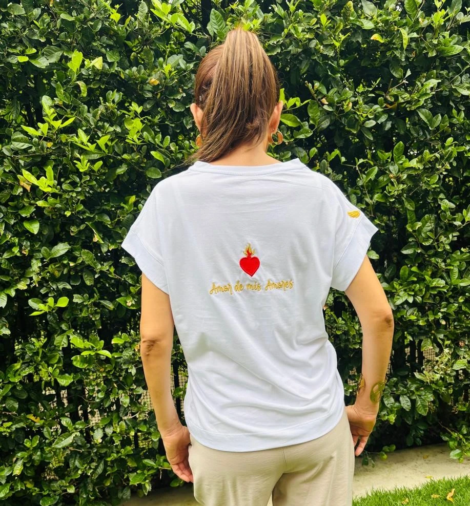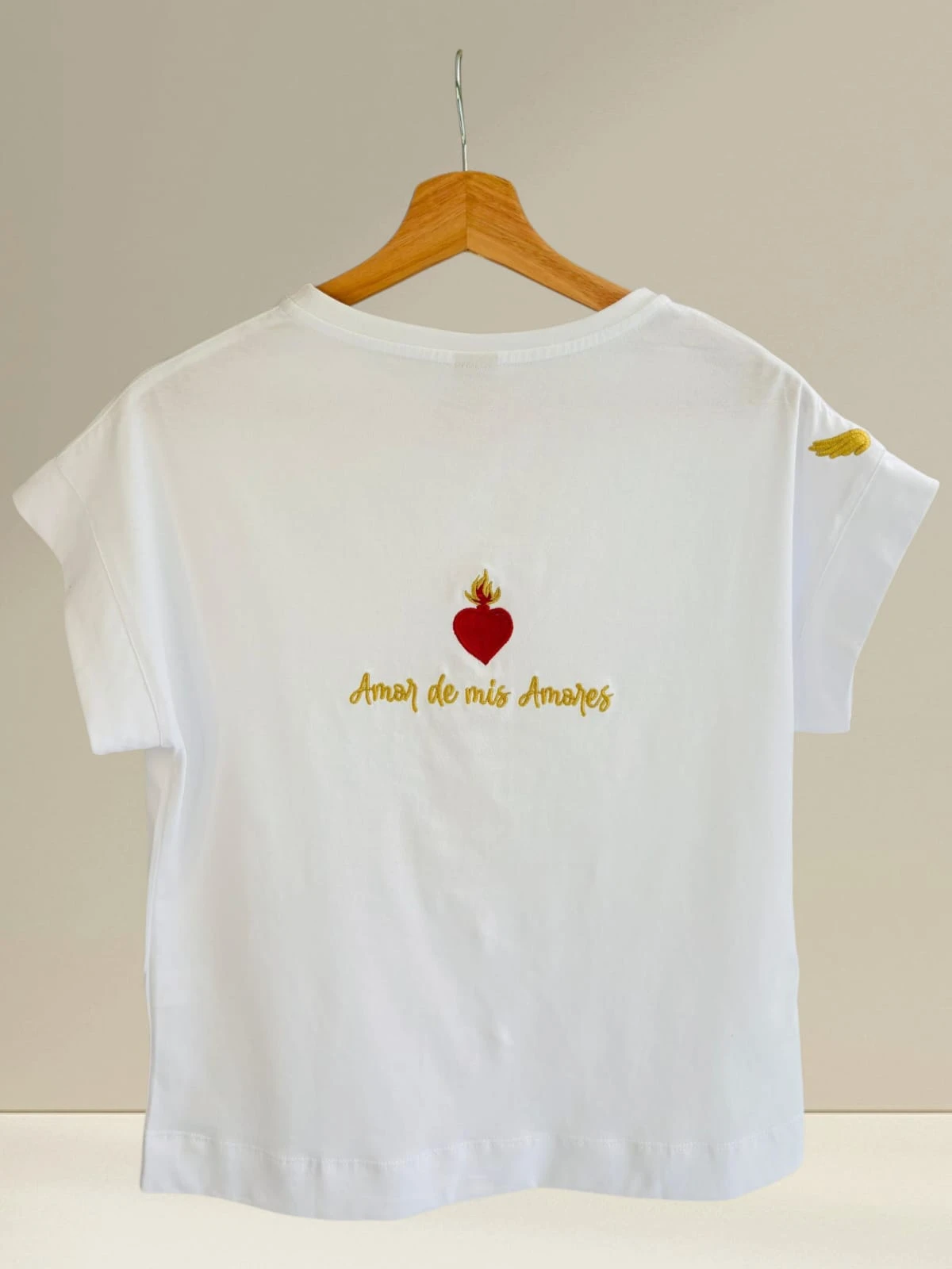Camiseta confeccionada en 100% algodón pima peruano, de silueta amplia y fresca, con un bordado lleno de detalles que resaltan espiritualidad y delicadeza.