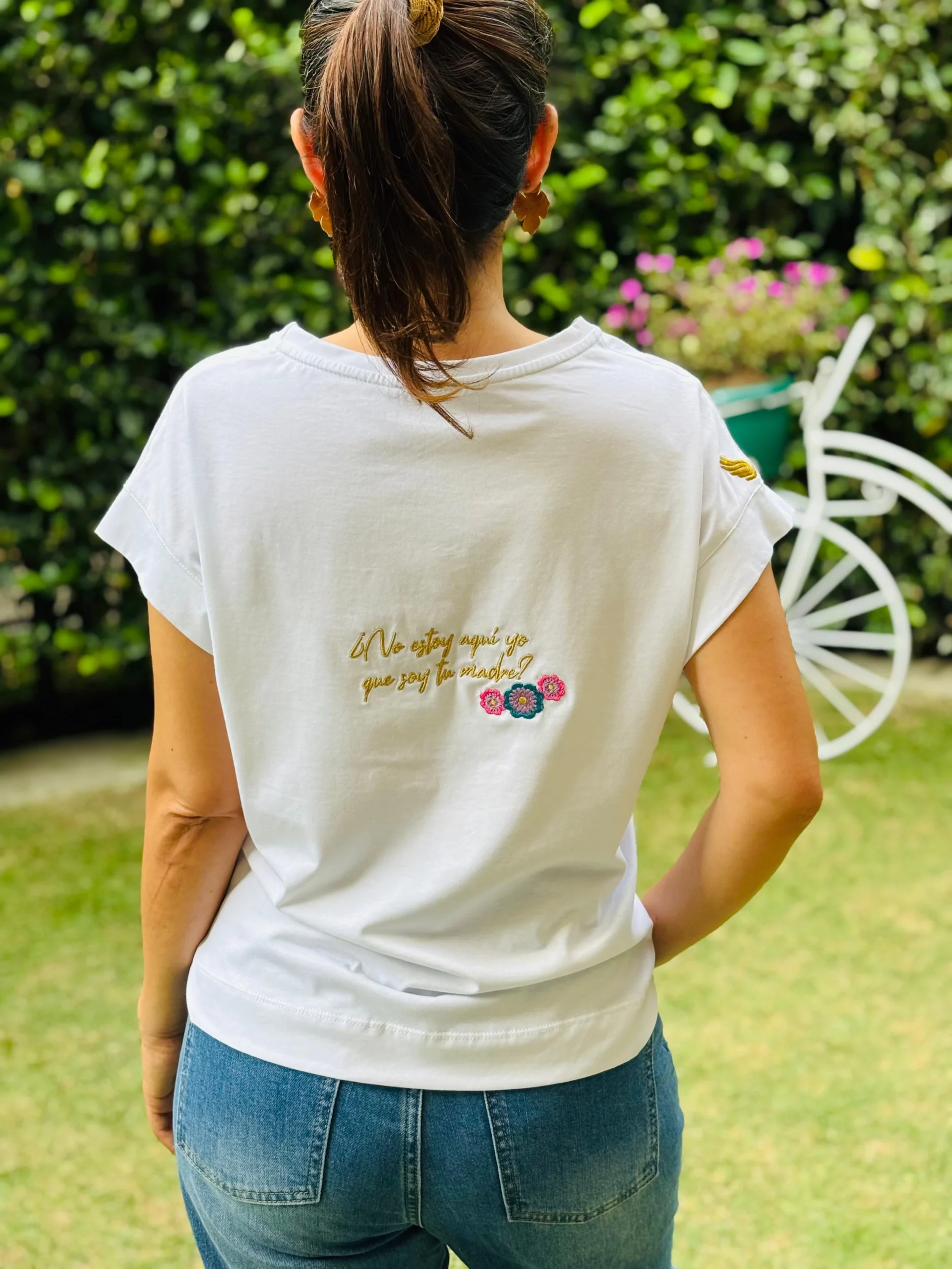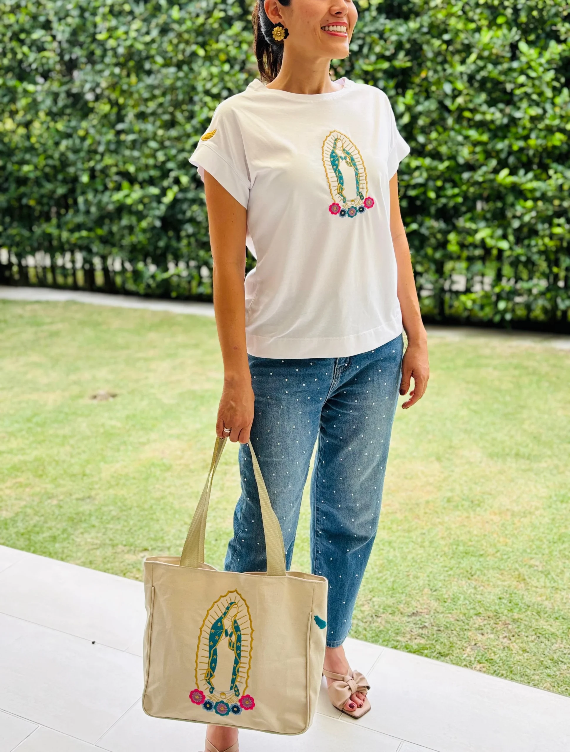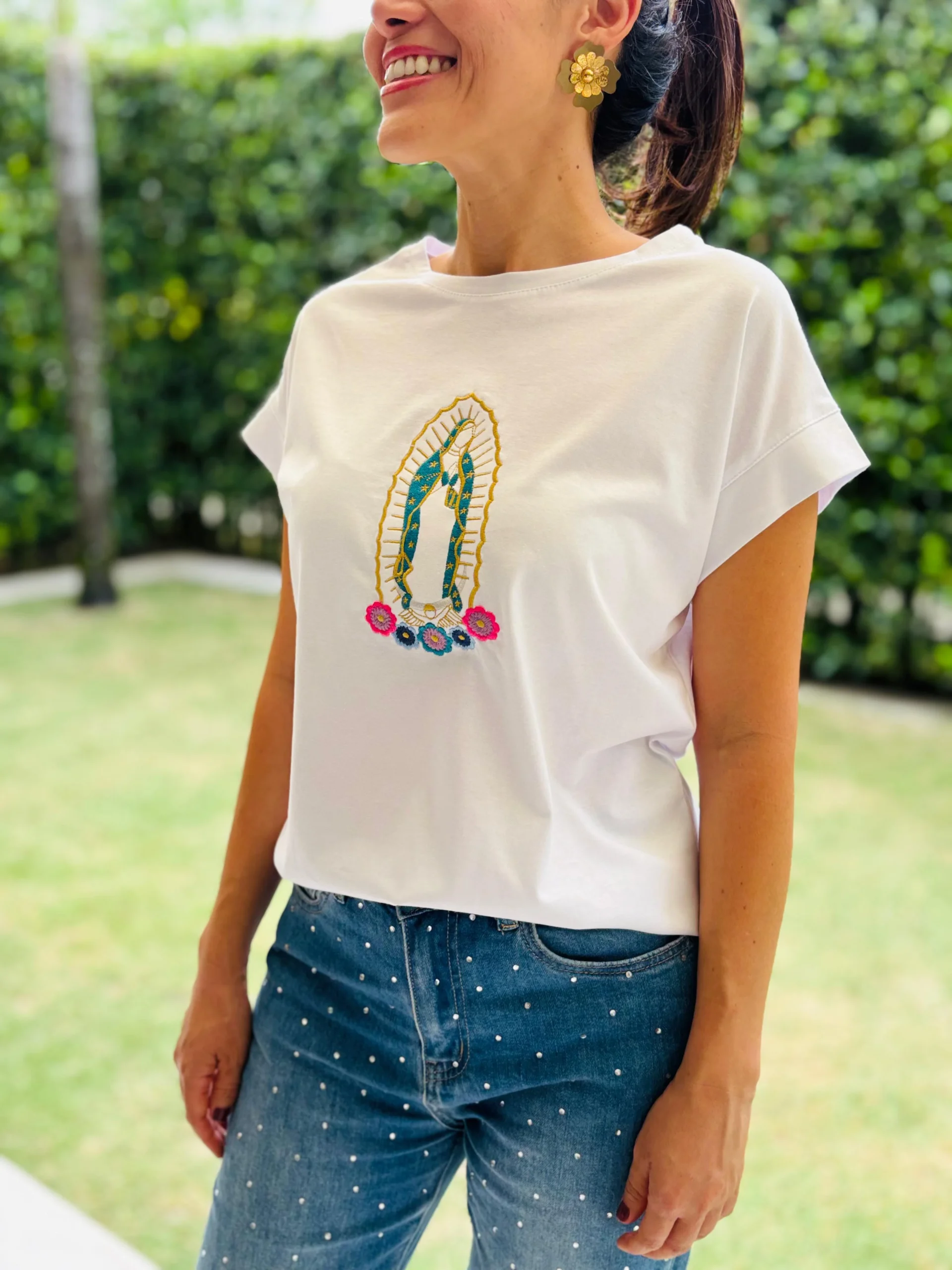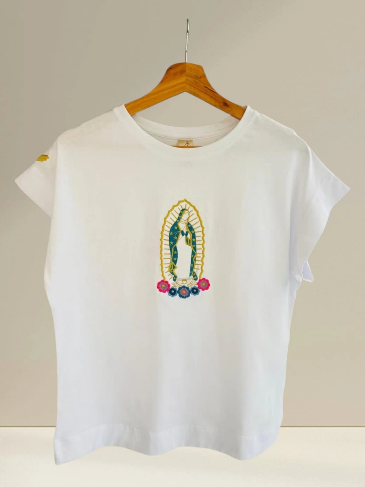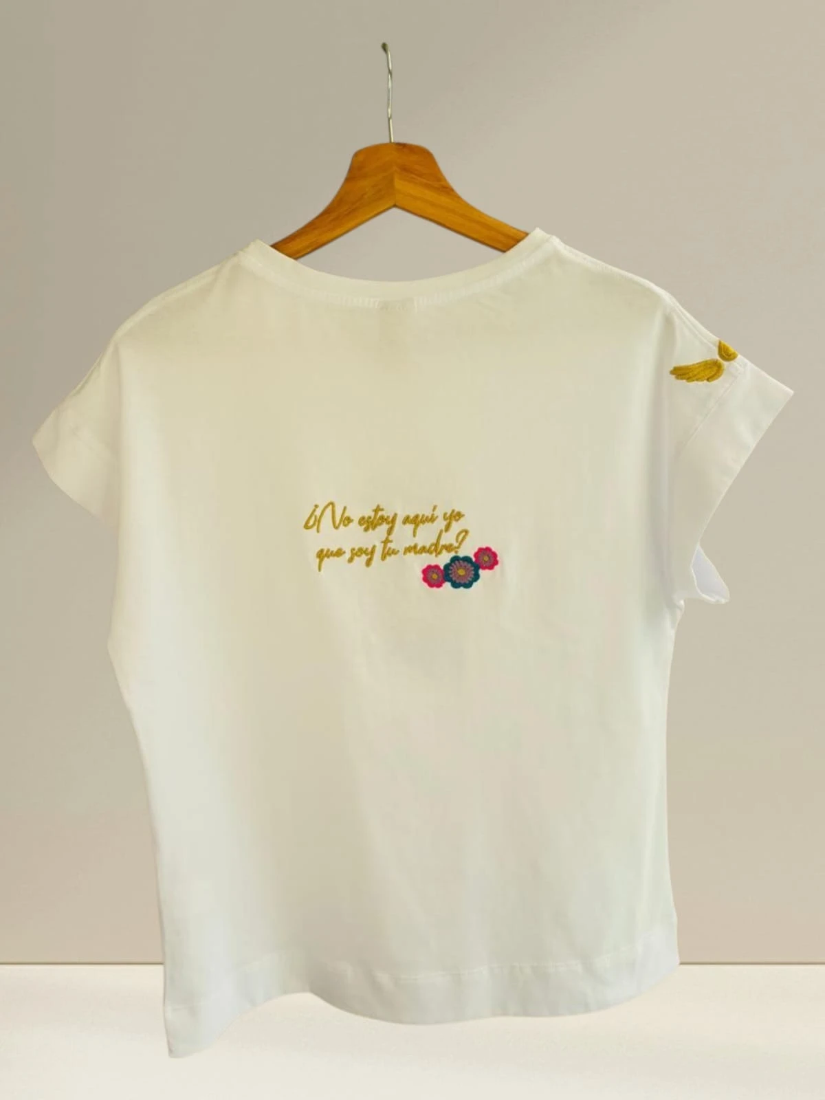 Camiseta confeccionada en 100% algodón pima peruano, suave, ligera y de excelente calidad. En la parte de enfrente encontramos a la Virgen Guadalupana bordada con gran detalle: sus rayitos en hilos dorados, el manto en tono verde con estrellitas, y en la parte inferior delicadas flores de colores. En la parte de la espalda se lee la frase “¿No estoy yo aquí que soy tu madre?” bordada en hilo dorado, acompañada de tres florecitas también bordadas. Como detalle distintivo, en la manga derecha se encuentra nuestra icónica alita bordada en hilo dorado, símbolo de delicadeza y espiritualidad.