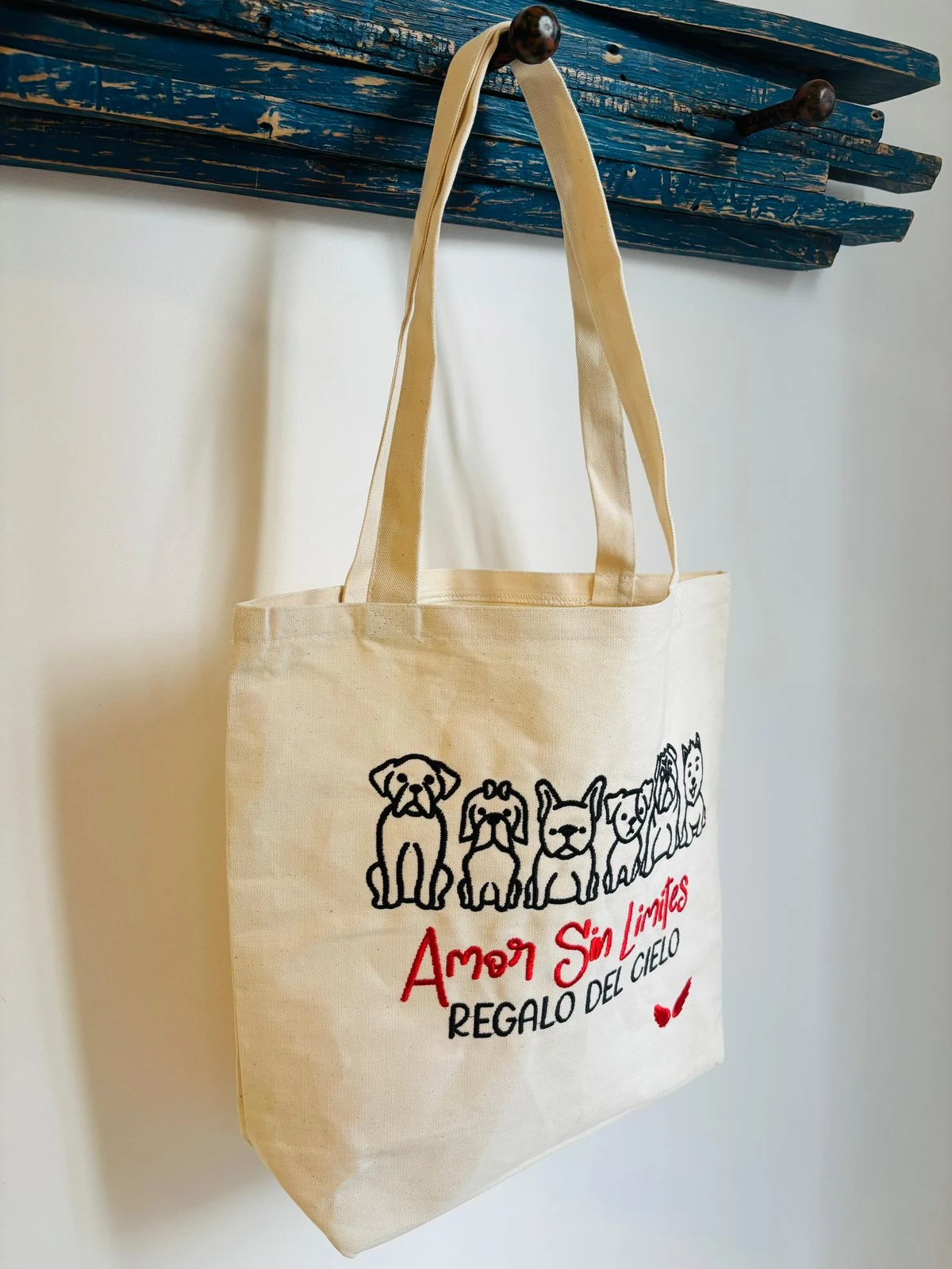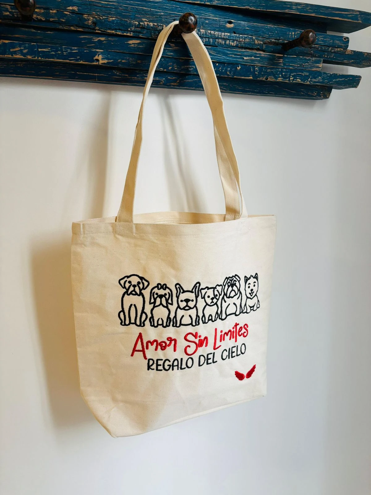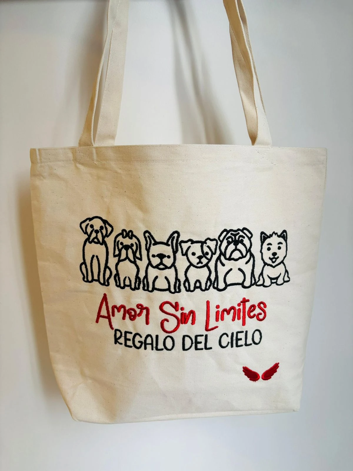 Tote Amor Sin Límites Confeccionado en lona 100% algodón, con asas elaboradas en el mismo material para conservar una estética natural y resistente. Medidas aproximadas: 36 cm de ancho · 32 cm de alto · 10 cm de fuelle. En la parte frontal se aprecian seis perritos bordados en forma de siluetas en hilo negro, representando la nobleza y el amor incondicional de nuestros compañeros de vida. Debajo de ellos, la frase “Amor Sin Límites” se borda en hilo rojo, y justo al finalizar, se complementa con “Regalo del Cielo” en hilo negro, utilizando letra mayúscula separada que resalta su significado. Como detalle final, en la parte inferior del costado izquierdo, se encuentra una alita bordada en hilo rojo, símbolo de compañía y protección.