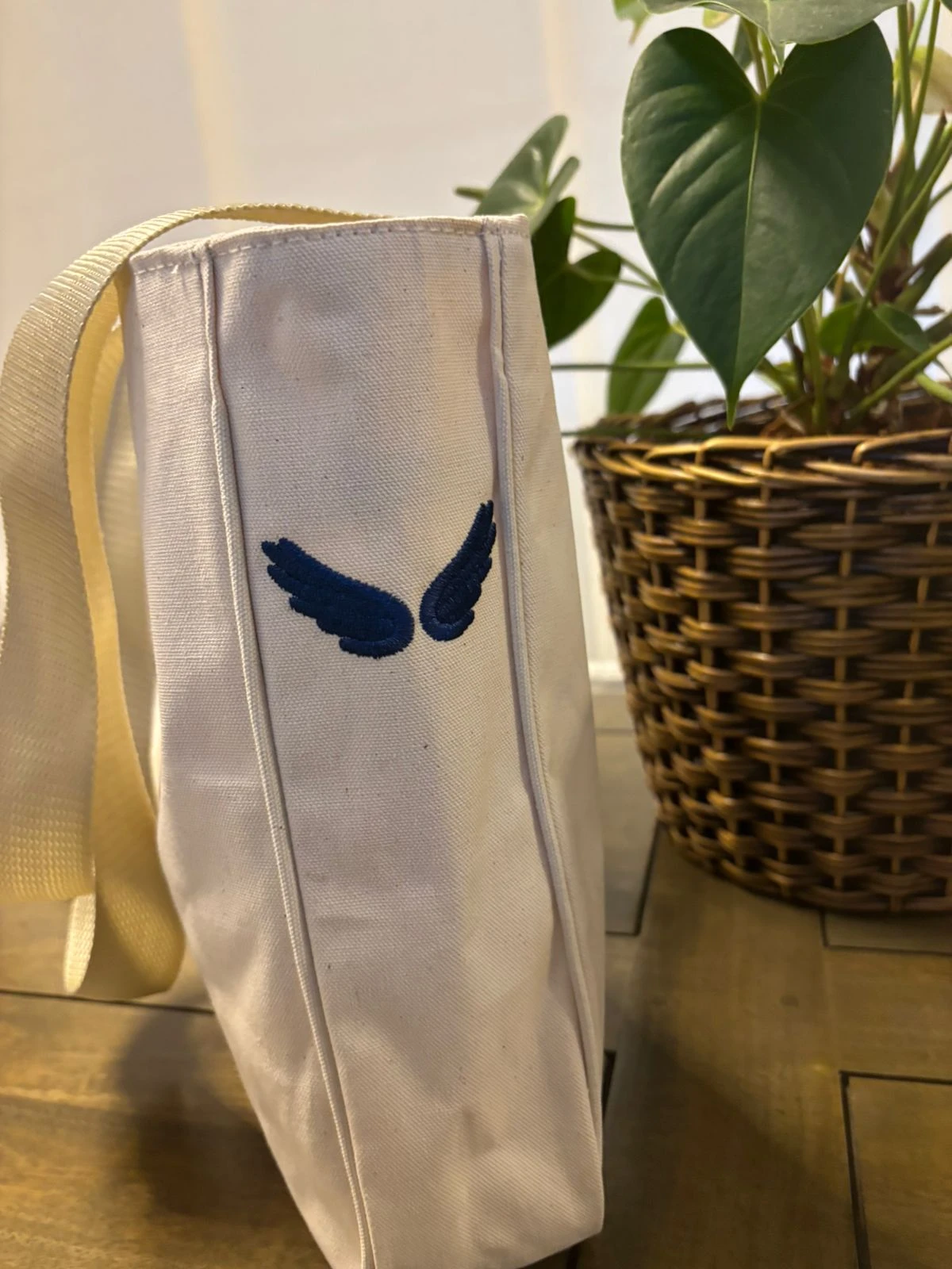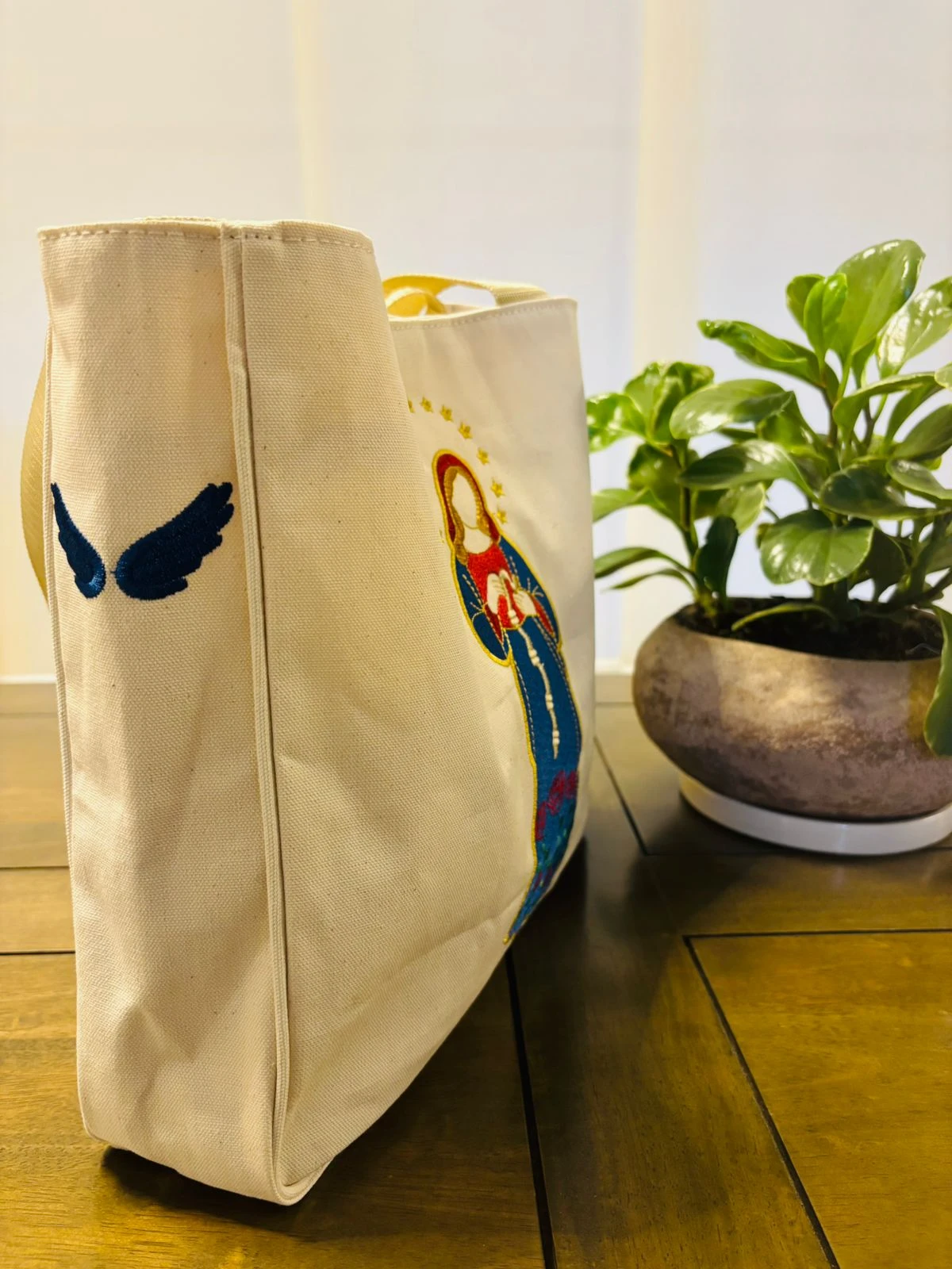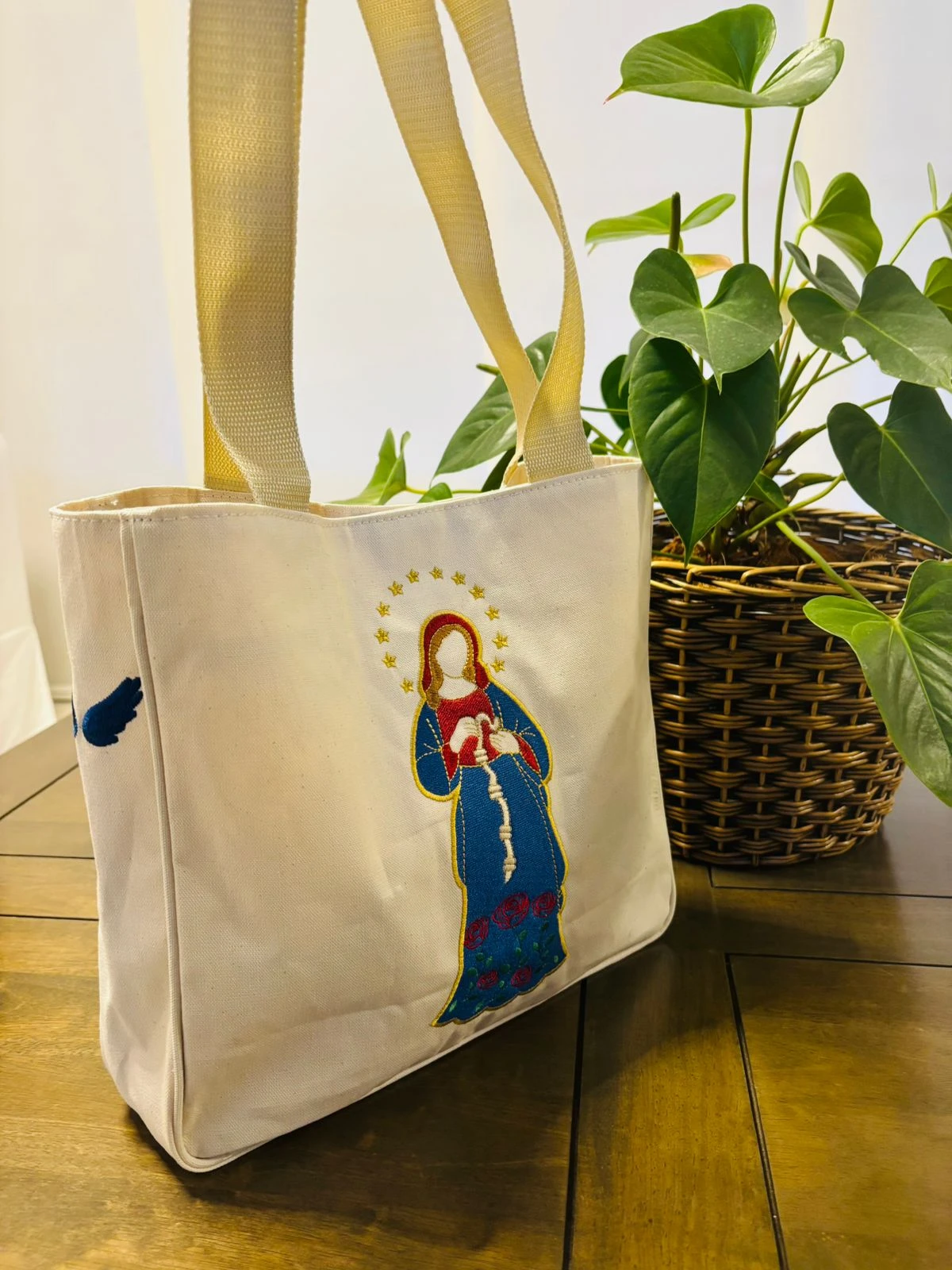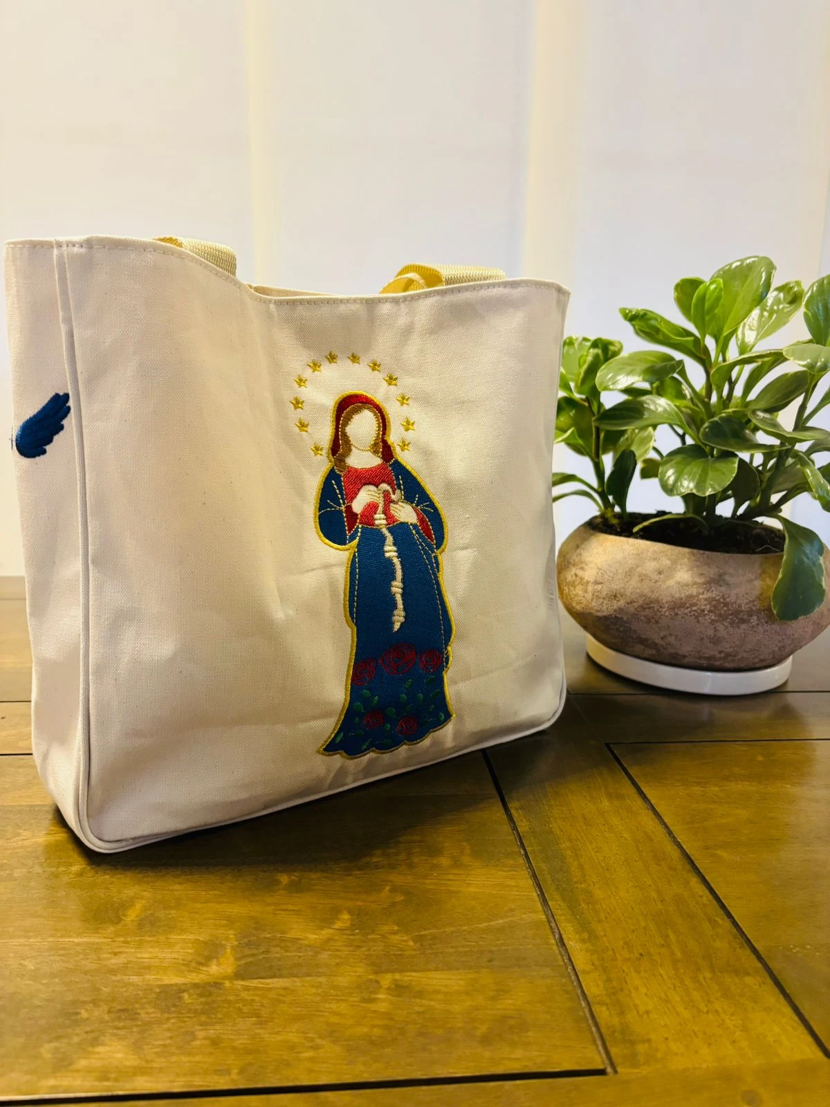 Tote confeccionado en lona 100% algodón tipo Calima, resistente, práctico y cargado de devoción. En la parte frontal luce la Virgen Desatanudos bordada con delicadeza y fuerza espiritual: • Viste su característico manto en tonos azul profundo y vinotinto, • acompañado de pequeñas rositas bordadas en hilo vinotinto que adornan suavemente su vestidura. Entre sus manos sostiene el lazo que representa los nudos de la vida, símbolo de auxilio y liberación. En su cabeza brillan dos estrellitas bordadas en hilo dorado, que iluminan su presencia maternal. Como sello distintivo de nuestra colección, en el fuelle en uno de sus costados se encuentra la alita representativa bordada en hilo azul intenso, discreta y llena de significado. Las asas en riata de nylon color claro proporcionan comodidad y firmeza para el uso diario. En el interior, el tote está completamente forrado y cuenta con tres bolsillos funcionales: uno con cierre para mayor protección, • y dos abiertos para fácil acceso. Su cierre principal es mediante botón magnético, práctico y seguro.