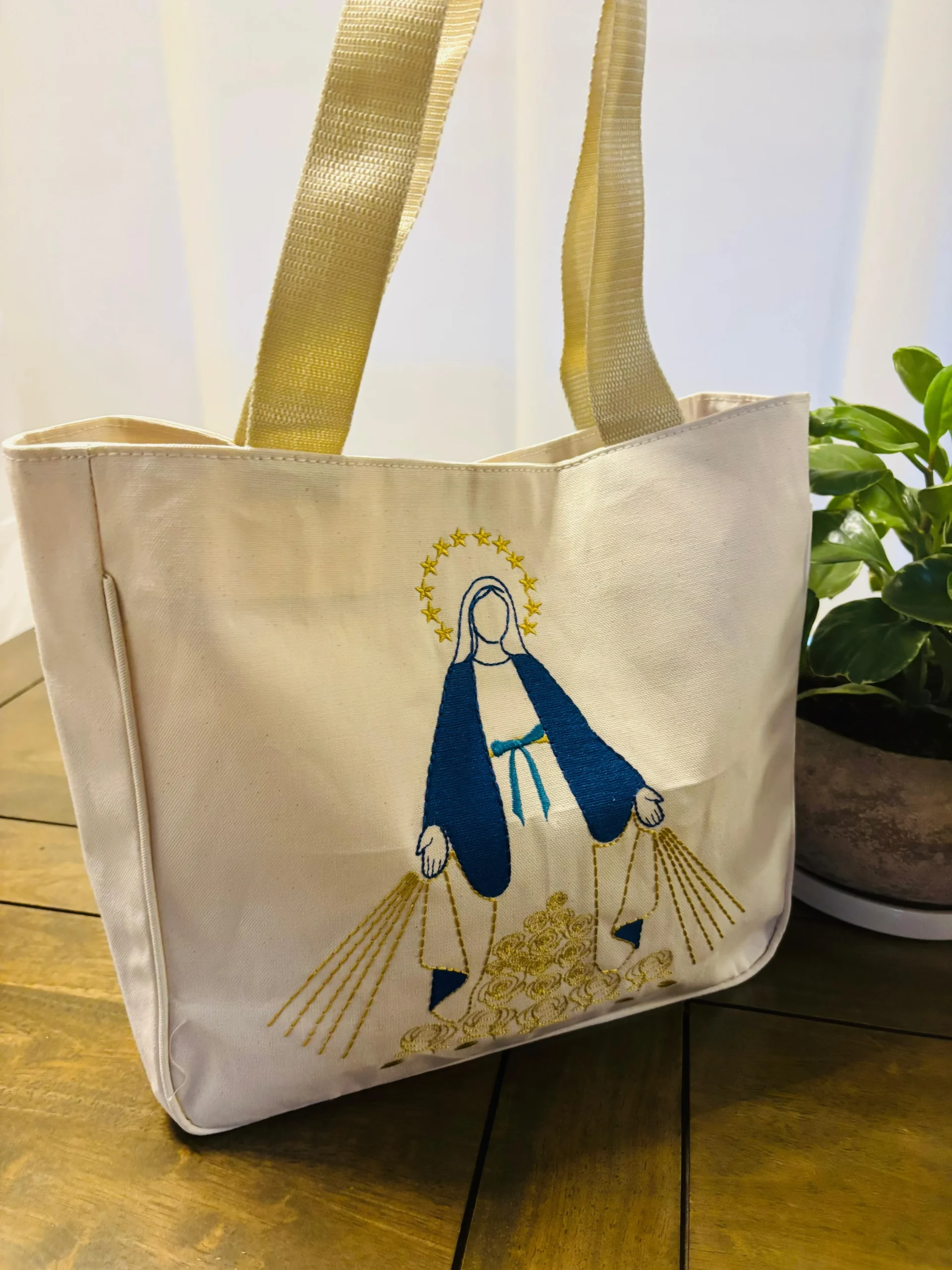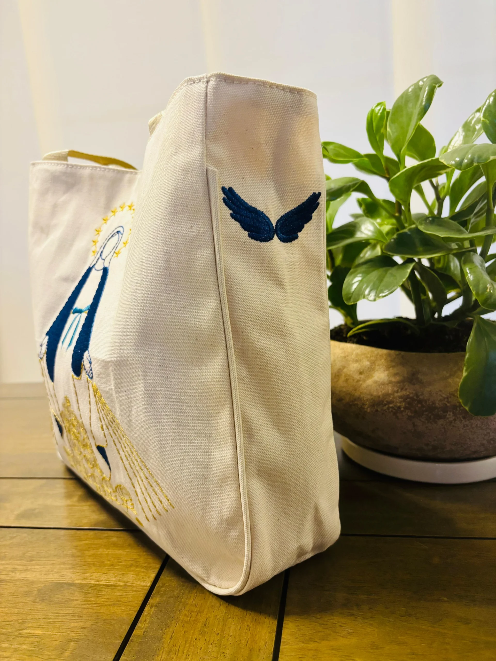 Tote elaborado en lona 100% algodón tipo Calima, resistente, funcional y lleno de devoción.